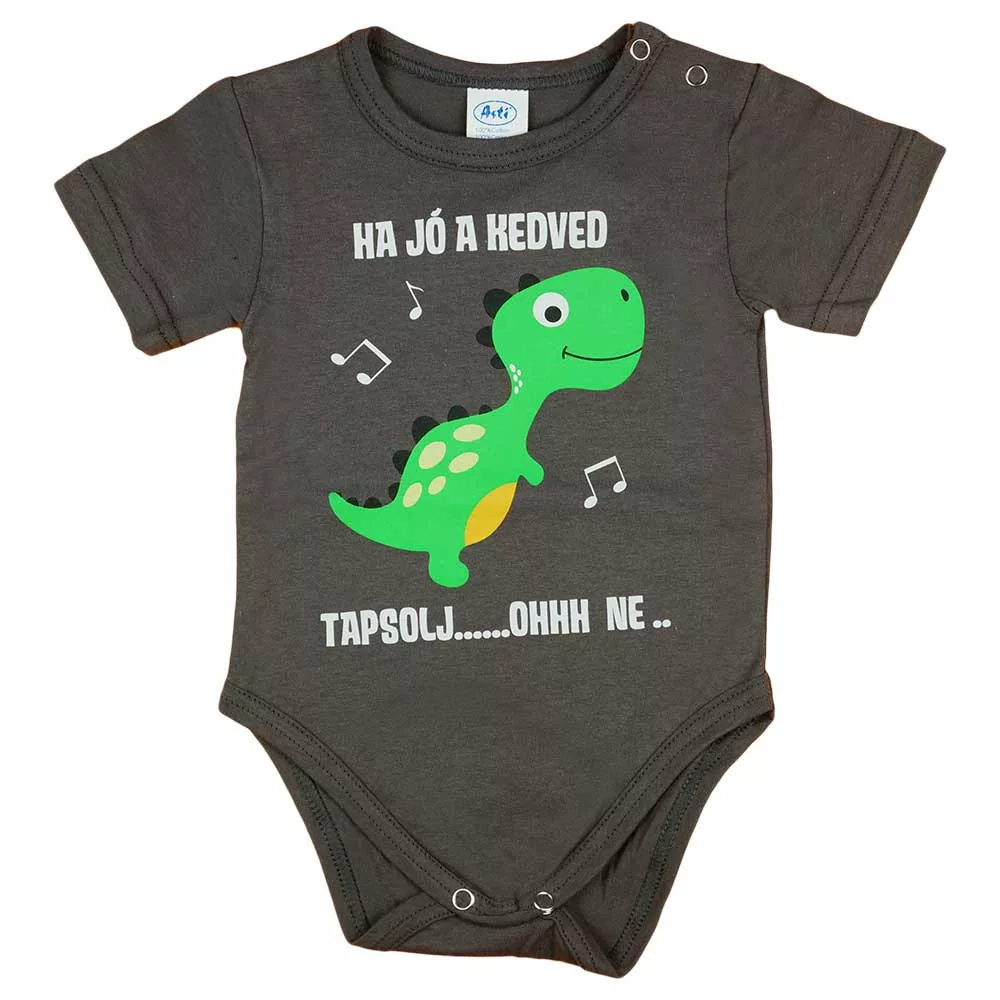 A kis dinórajongók imádni fogják ezt a szürke, rövid ujjú bababodyt, amelyen vidám dinós minta díszeleg. A vállán található patentnak köszönhetően könnyedén fel- és leöltöztheted a picit, így a pelenkázás, vagy a fürdés sem okoz majd gondot. A body anyaga 100% pamut, amely különösen kényelmes viseletet biztosít a baba érzékeny bőrének. Az Andrea Kft. által, Magyarországon gyártott body minden részletében a minőségre és a bababarát kialakításra helyezi a hangsúlyt. A nikkelmentes patentok garantálják, hogy a termék nem vált ki allergiás reakciót a nikkelre érzékeny babáknál. A szürke dinós body tökéletes választás a kisfiúk számára, akik a kényelem mellett szeretik a vidám, játékos mintákat is.