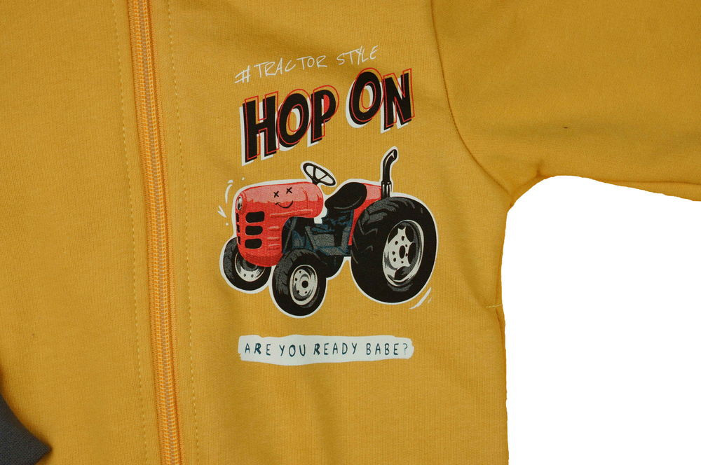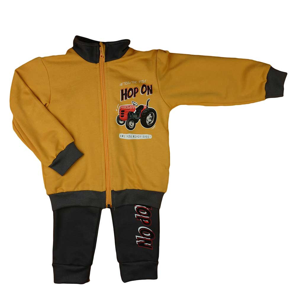 Az okker színű, belül bolyhos fiú szabadidő szett traktoros mintával a gyermek ruhatárának nélkülözhetetlen darabja lesz. A kétrészes szett kiváló minőségű, 100% pamut anyagból készült, amely belül bolyhos, így különösen meleg és kényelmes viseletet biztosít a hideg őszi és téli napokon. A felső rész cipzárvédővel ellátott, hogy megóvjuk gyermekünk érzékeny bőrét a dörzsölődéstől. A nadrág gumis derékkal és két praktikus zsebbel rendelkezik, ami tökéletes választás a játékhoz és a kalandokhoz. Ez a szett egyben és külön-külön is hordható, így variálható a kinézet. Minőségi magyar termék, amely a legmagasabb, I. osztályú minősítést kapta.