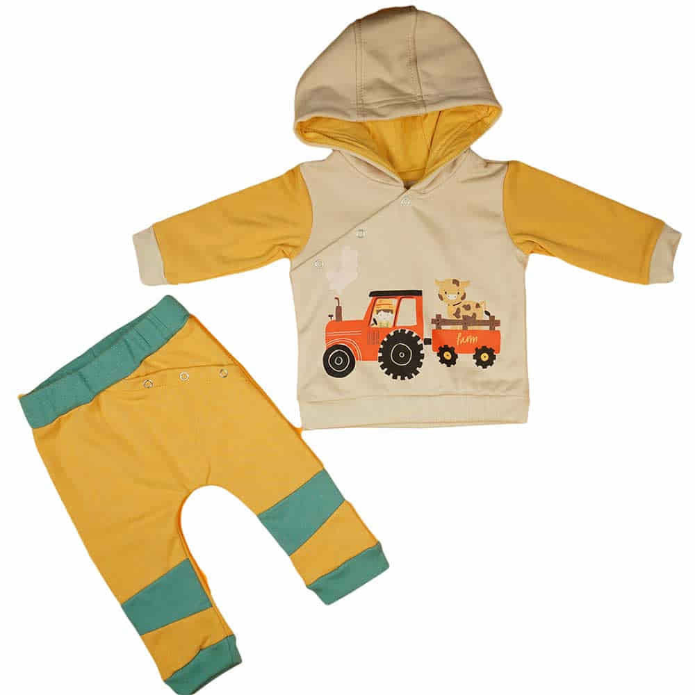 Engedje meg, hogy bemutassuk ezt a bolyhos belsővel készült fiús szabadidő szettet, melynek traktoros mintája igazán vonzóvá teszi a kis traktorrajongó számára! A homokszínű, kétrészes szett kényelmes viseletet biztosít, akár az őszi, akár a téli napokon. A puha, bolyhos pamut anyag és a rugalmas derékú nadrág tökéletes illeszkedést és kényelmet nyújt, míg a kapucnis felső rész cipzárvédővel ellátva készült, így garantáltan nem irritálja gyermekünk érzékeny bőrét.