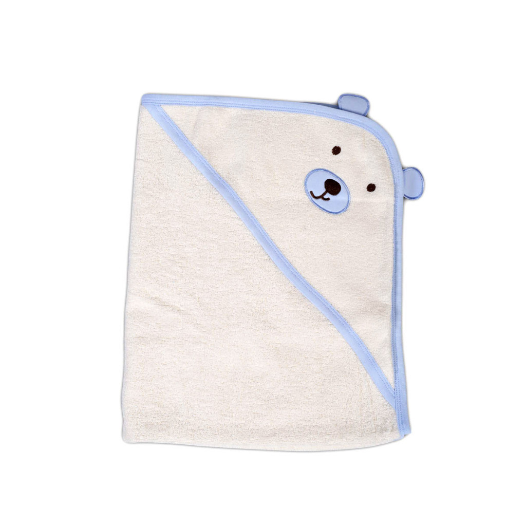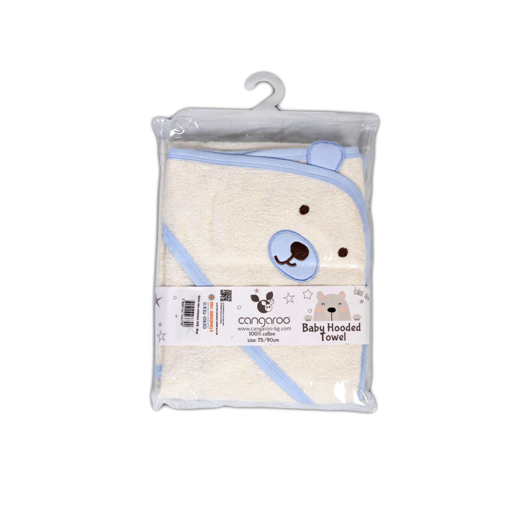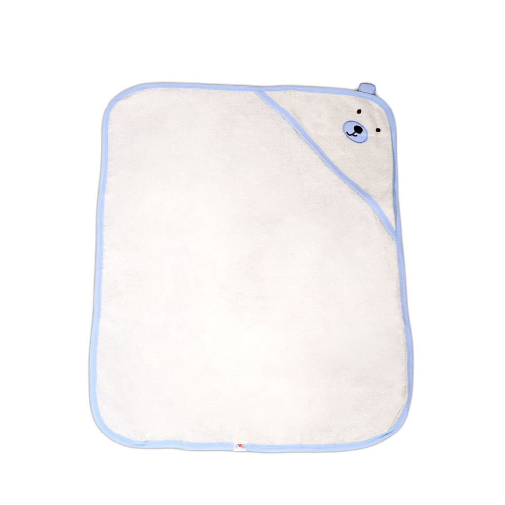 BALOO kapucnis törölköző/kifogó/kapucnis fürdetőlepedő macis, 100% pamut frottír anyagból készült. Alapszíne fehér, szegélycsík színe Kék.