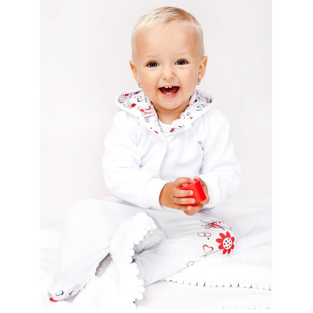 Szép szemis pulóver kapucnival és hímzett katicabogár mintájával. Anyaga: 80% pamut, 20% poliészter.
