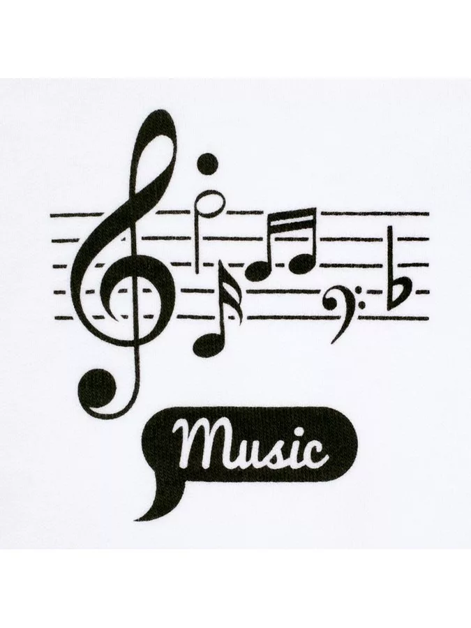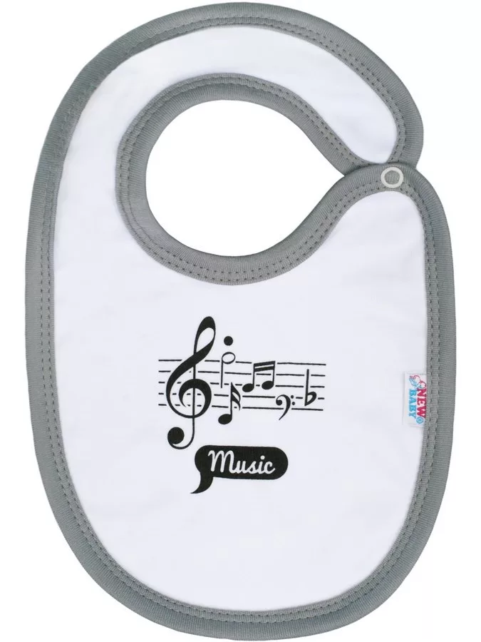 Eredeti, divatos pamut baba előke New Baby Music. Hangjegyekkel és hangszerekkel díszitve. A hátsó részén kapcsolható. Puha minőségi anyagból készült. Lányoknak és fiúknak is alkalmas. Anyaga 100% pamut. Mérete: hossz kb 20 cm.
