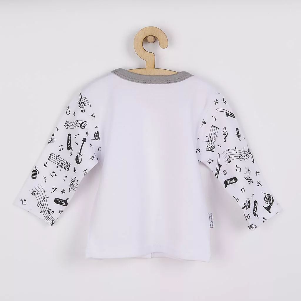 Eredeti, divatos pamut baba kabátka New Baby Music. A kabátka egyszínű az ujjai hangjegyekkel és hangszerekkel díszitve. Teljes hosszában patentos, ami megkönnyíti a baba öltöztetését. Puha minőségi anyagból készült, amibe a baba kényelmesen fogja érezni magát. Lányoknak és fiúknak is alkalmas. Anyaga 100% pamut. Mérete: mellbőség kb 44 cm, ujjhossz kb 20 cm, teljes hossz kb 28 cm.