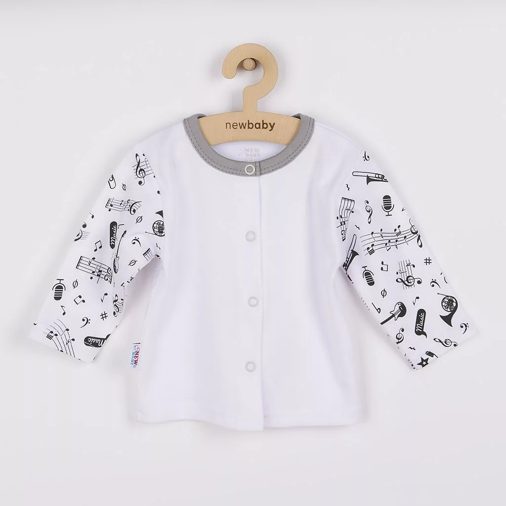 Eredeti, divatos pamut baba kabátka New Baby Music. A kabátka egyszínű az ujjai hangjegyekkel és hangszerekkel díszitve. Teljes hosszában patentos, ami megkönnyíti a baba öltöztetését. Puha minőségi anyagból készült, amibe a baba kényelmesen fogja érezni magát. Lányoknak és fiúknak is alkalmas. Anyaga 100% pamut. Mérete: mellbőség kb 46 cm, ujjhossz kb 22 cm, teljes hossz kb 29 cm.