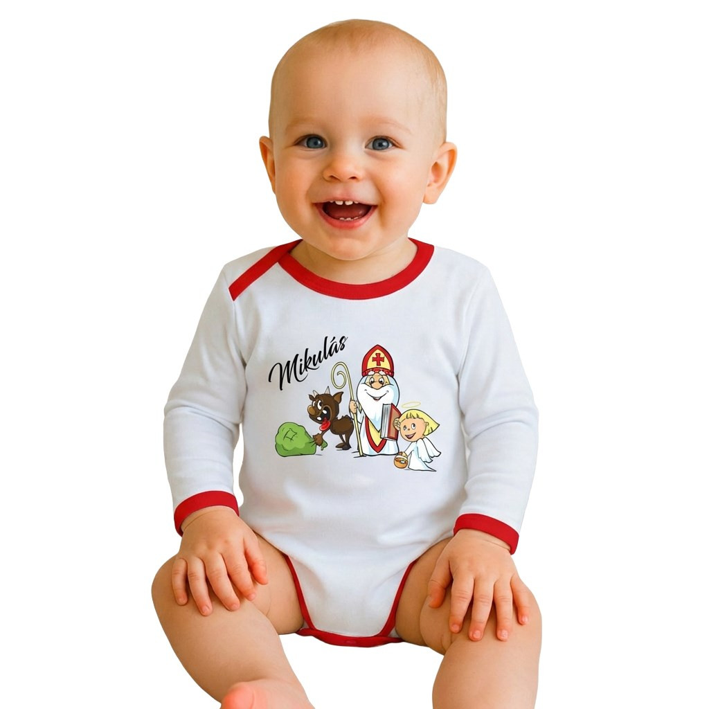 Eredeti pamut baba hosszú ujjú body New Baby vicces képpel, felirattal Mikulás és színes szegéllyel díszitve. A nyomtatáshoz használt színek minősítettek és alkalmasak a gyermekek számára. Puha kellemes minőségi anyagból készült, amibe a baba kényelmesen fogja érezni magát. Vállnál és az üllepénél patentos, ami megkönnyíti a baba öltöztetését és pelenkázását. Anyaga: 100% pamut. Mérete: mellbőség kb 42 cm, ujjhossz kb 23 cm, teljes hossz kb 38 cm.
