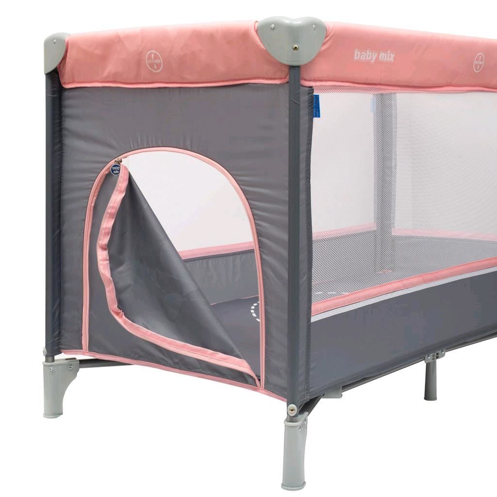 A praktikus hordozható utazóágy Baby Mix nemcsak utazóágynak, hanem járókának is használható. Élvezze az időt babájával, nyaraláskor vagy útközben. Az egyszerű mechanizmusnak köszönhetően gyorsan és egyszerűen összecsukható, beteheti a mellékelt, pántokkal ellátott praktikus táskába, és kényelmesen beteheti az autóba. Az ágy nagyon könnyű, fékkel ellátott kerekekkel van felszerelve, így könnyen áthelyezheti egy másik szobába, teraszra vagy kertbe.