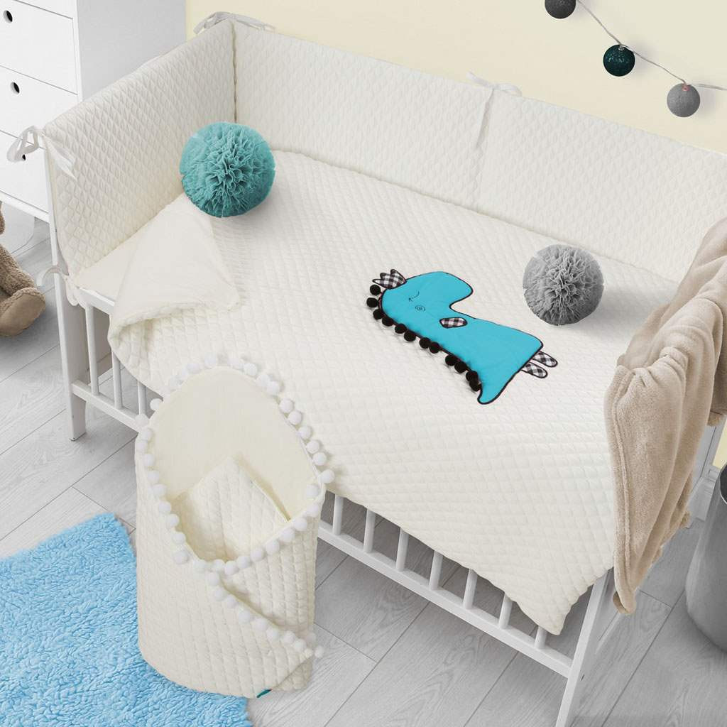 6 részes ágyneműgarnitúra Belisima Dino 3D. 3D-s mintával díszitvet. Puha, kellemes anygból készült. Anyag: felső oldala kötött anyag: 50% pamut, 50% poliészter. Alsó oldala 100% pamut, töltet: 100% poliészter. Párnahuzat 40x60 cm, takaró huzat 100x135 cm, rácsvédő 180 cm, baldachin 150x200 cm, párna és paplan. Puha minőségi anyagból készült. Összetétel: 100% pamut. Ezek a termékek biztonságosak, mivel: a természetes pamut nem okoz bőrirritációt, mivel nem tartalmaz formaldehidet és egyéb, csecsemőkre káros anyagokat. Nem veszítenek színeik élénkségéből és nem színezi el a többi ruhát. Kellemes mintázatúak és színei nyugtató hatásúak. Az ágyneműhuzaton használt cipzár "biztonságos cipzár" lengővégek nélkül, amit a gyermek nem vehet le és nem nyelhet le! Nem tartalmaznak gombokat, sem műanyag illetve acél darabkákat, melyek veszélyesek lennének gyermeke számára. A párna és a paplan töltete antialergén anyagból készült ami azt jelenti, hogy nem terjeszt mikroorganizmusokat és penészt.