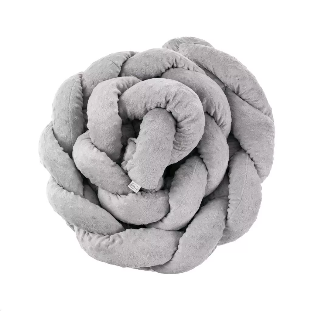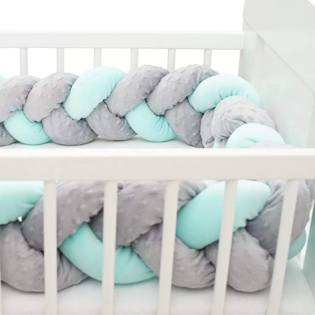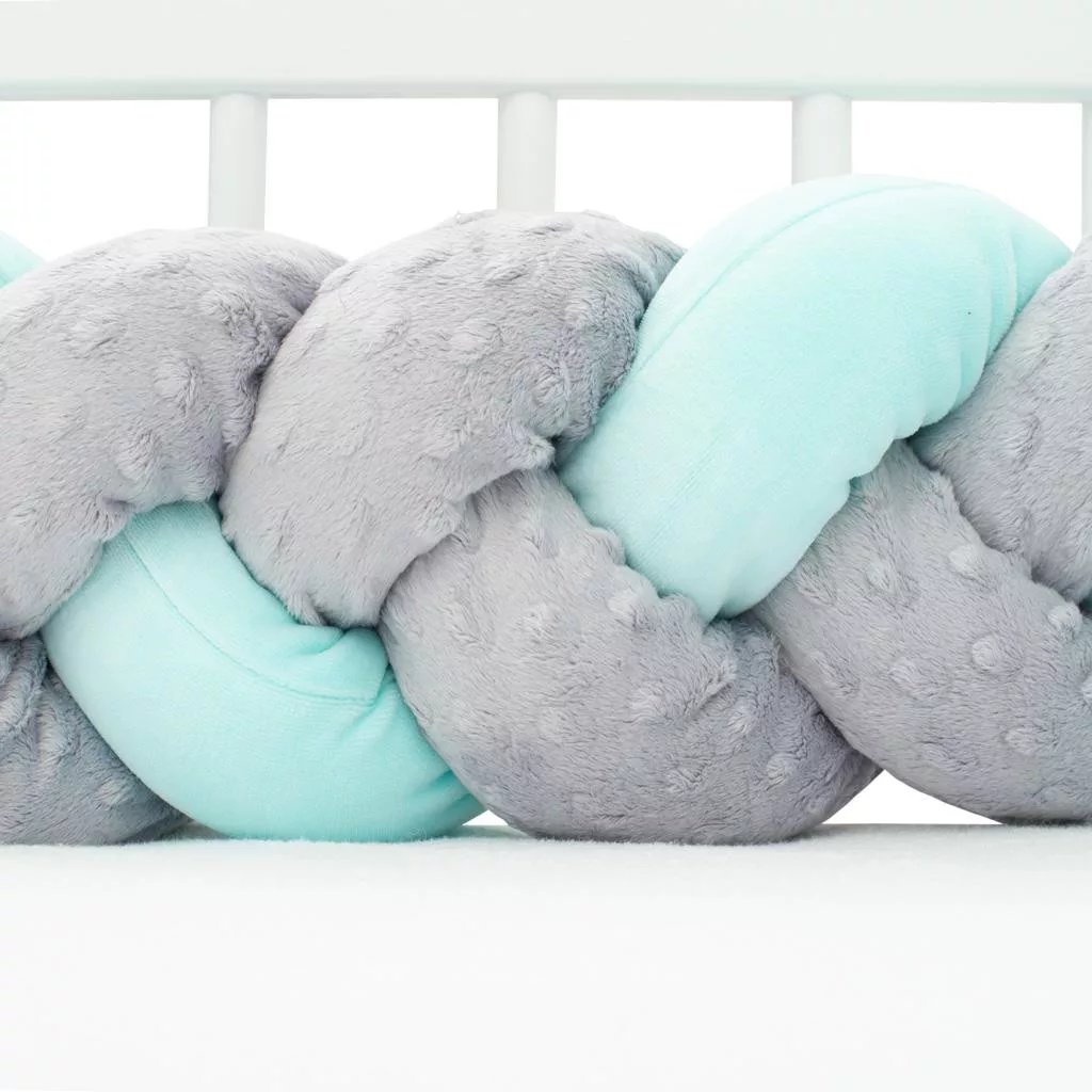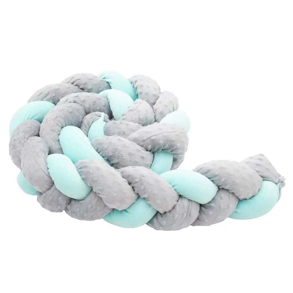Fonott rácsvédő kiságyba Belisima, puha és kellemes tapintású. Pamutból és antiallergén poliészter töltőanyagból készült. A csomag szalagokkal rendelkezik, hogy a copfot a kiságyhoz lehessen rögzíteni. A rögzítéssel biztosítja gyermekének a biztonságos és egészséges alvást. A copf felhasználható babafészekként, vagy dekorációként a szobába, esetleg mint egy szigetelés a fal hidegétől.
