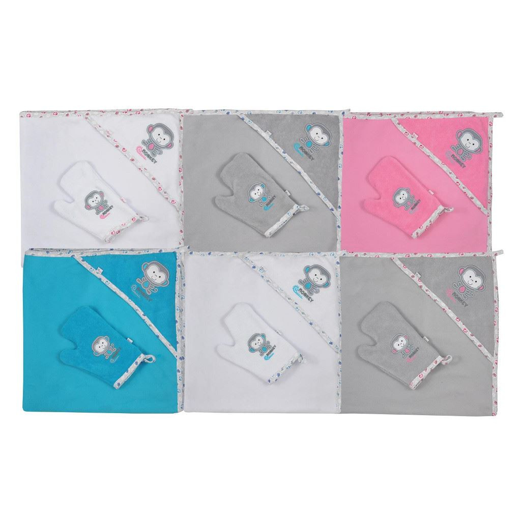 Színes baba kifogó Koala Jungle kapucnival és fürdőkesztyűvel. A csomag tartalmaz egy praktikus fürdőkesztyűt is. A kifogó kellemes pamutból készült, amely nagyon érzékeny a baba bőrre, ezért ideális a kisbabák számára. Méretek: kifogó: kb 90x90 cm. Anyag: 85% pamut, 15% poliészter.