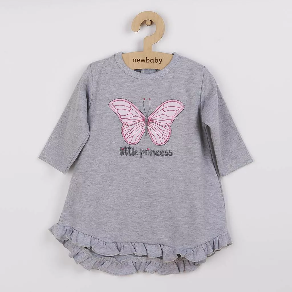 Baba ruha turbán sapkával New Baby Little Princess. Az A alakú ruha, kellemes pamut anyagból készült, amelynek köszönhetően őszi és tavaszi napokra alkalmas. Gyönyörű pillangóhímzéssel, felirattal little princess és fodorral díszítve. A hímzés karcolások ellen alá van ragasztva. A ruha hátulja kissé hosszabb. A nyakán hátul patentos. Anyag: 100% pamut.