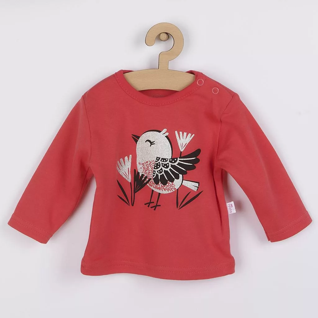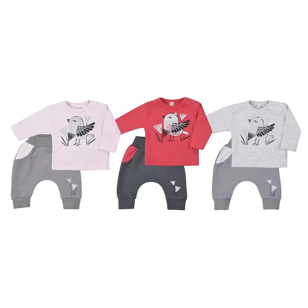 Baba 2 részes pamut együttes Koala Birdy. Az együttes melegítő nadrágot és pólót tartalmaz. A melegítő nadrág divatos ejtett üleppel, széles szegéllyel és aranyos képpel díszítve. A póló aranyos képpel díszítve. Vállán patentos. Kellemes anyagból készült. A szett nemcsak babakocsiba, gyerekülésbe, hanem sétákhoz és kényelmes otthoni öltözetnek is tökéletesen alkalmas. Anyaga: 100% pamut.