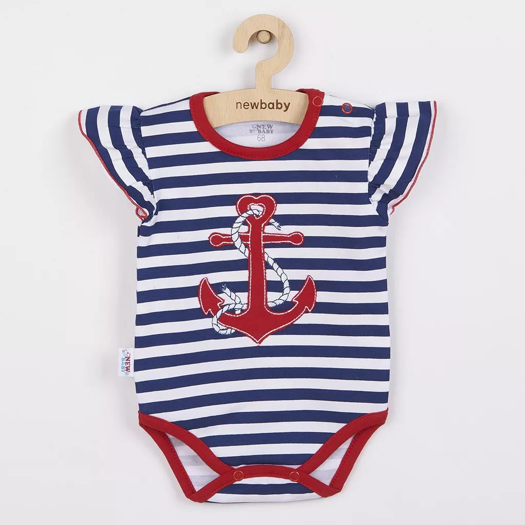 Baba nyári pamut rövid ujjú body New Baby Marine. A csíkos body aranyos fodros ujjakkal és horgony rátéttel rendelkezik. A rátét béléssel van takarva. A nyak, az ujjak és a lábak körül piros szegély található. Vállnál és az ülepénél patentos. Nagyon kellemes és puha anyagból készült. A New Baby számára nagyon fontos a vásárló elégedettsége, ezért kínáljuk Önnek a New Baby Marine kollekciót. Anyaga: 100% pamut.