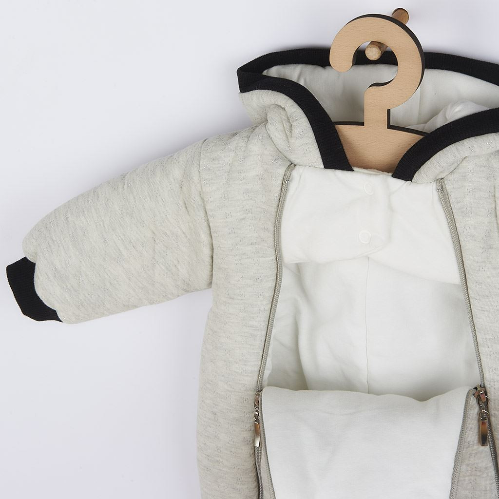 Eredeti és stílusos baba téli kezeslábas kapucnival Koala Star Vibes, kisbabák számára. Teljes hosszában a két oldalán cipzáros, ami megkönnyíti a baba öltöztetését és pelenkázását. Nagyon kellemes és puha anyagból készült, amelyben a baba nagyon kényelmesen fogja érezni magát. A kezeslábas teljesen bélelt pamut béléssel. A bélés a ruházat fontos része, növeli a ruha tartósságát. Ezenkívül a kezeslábas antiallergén szállal van tőltve, ami növeli a meleget. Ideális csecsemőknek télen és ősszel. A divatos dizájnak köszönhetően a kollekcióba a baba nagyon aranyos lesz. Anyaga: felső réteg 77% pamut, 20% poliészter, 3% lurex szál, bélés 100% pamut, antiallergén szál töltet-100% poliészter-120g / m2.