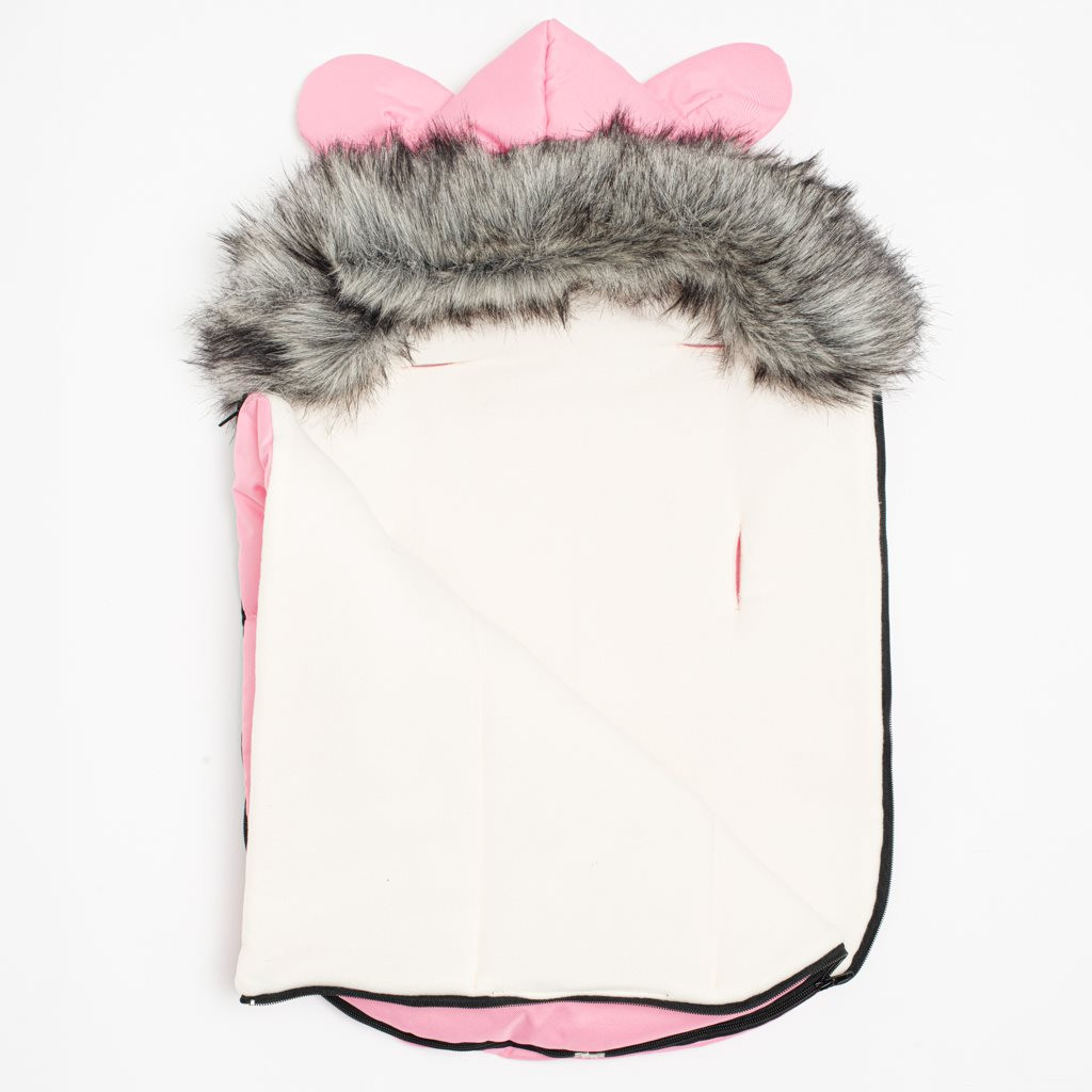 Többfunkciós gyerek téli lábzsák füles kapucnival New Baby belső fleece réteggel, ideális mély babakocsiba, sport babakocsiba és a biztonsági öveknek készítet lyukaknak köszönhetően autósülésbe is használható. Meleg fleece anyaggal van bélelve, amely nagyon puha és kényelmes, és melegen tartja a kisbabát. A lábzsák két oldala cipzáros. Mű prémmel van befejezve, amely eltávolítható, patentos.