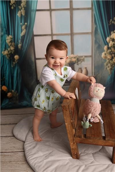 Kényelmes és stílusos 2 részes nyári New Baby Avocado muszlin együttes. Az együttes pólót és rövidnadrágot tartalmaz. Egyszínű póló, vállán patentos gombolással, amely megkönnyíti