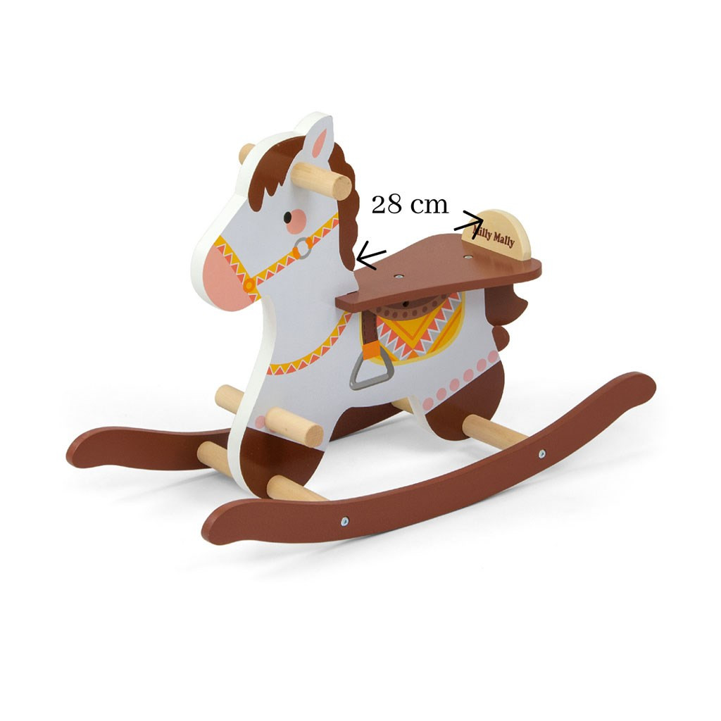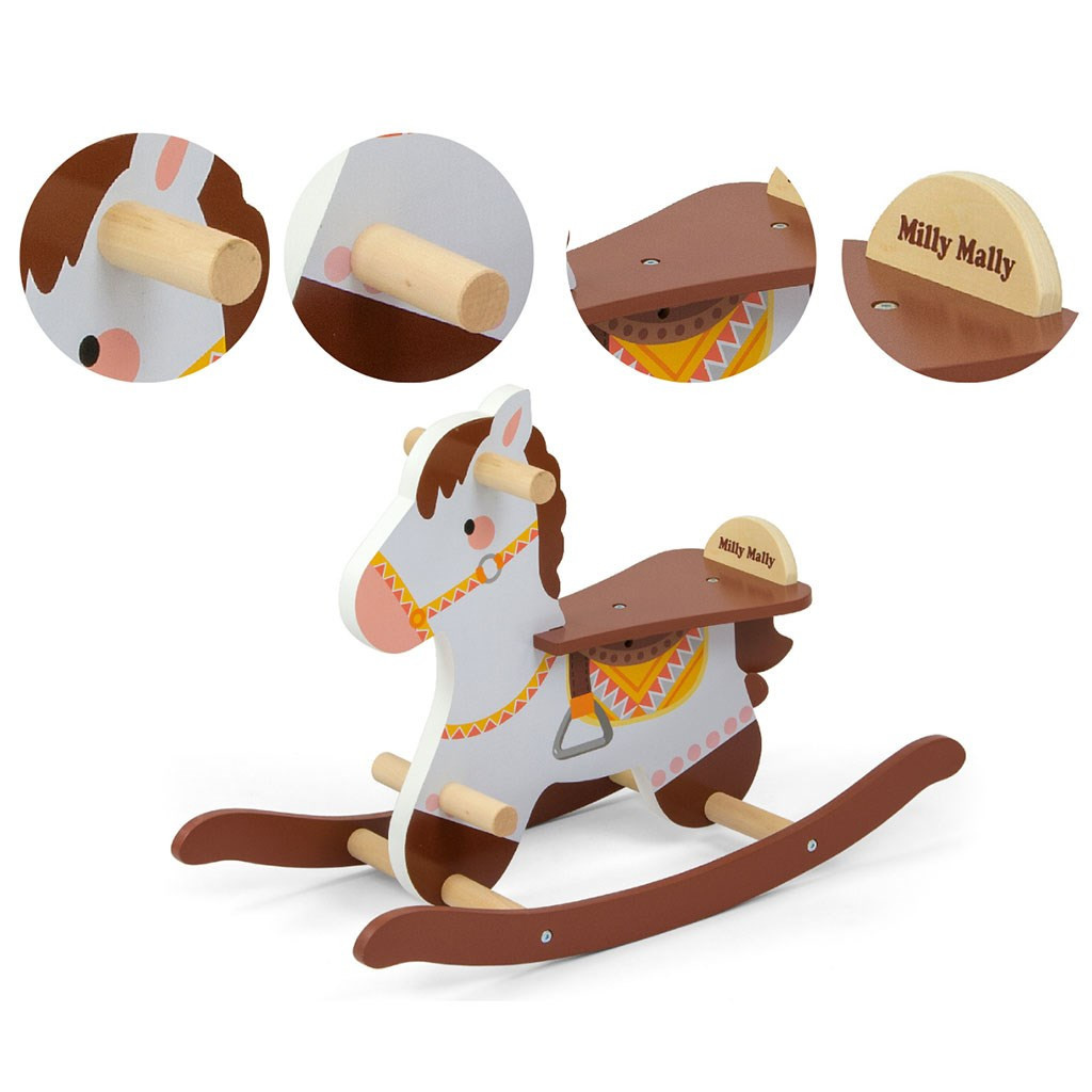 A fából készült hintaló a fejénél fogantyúkkal, a legkisebbek számára pedig egy kiegészítő lábtartóval rendelkezik, amely segít megtartani az egyensúlyt játék közben.